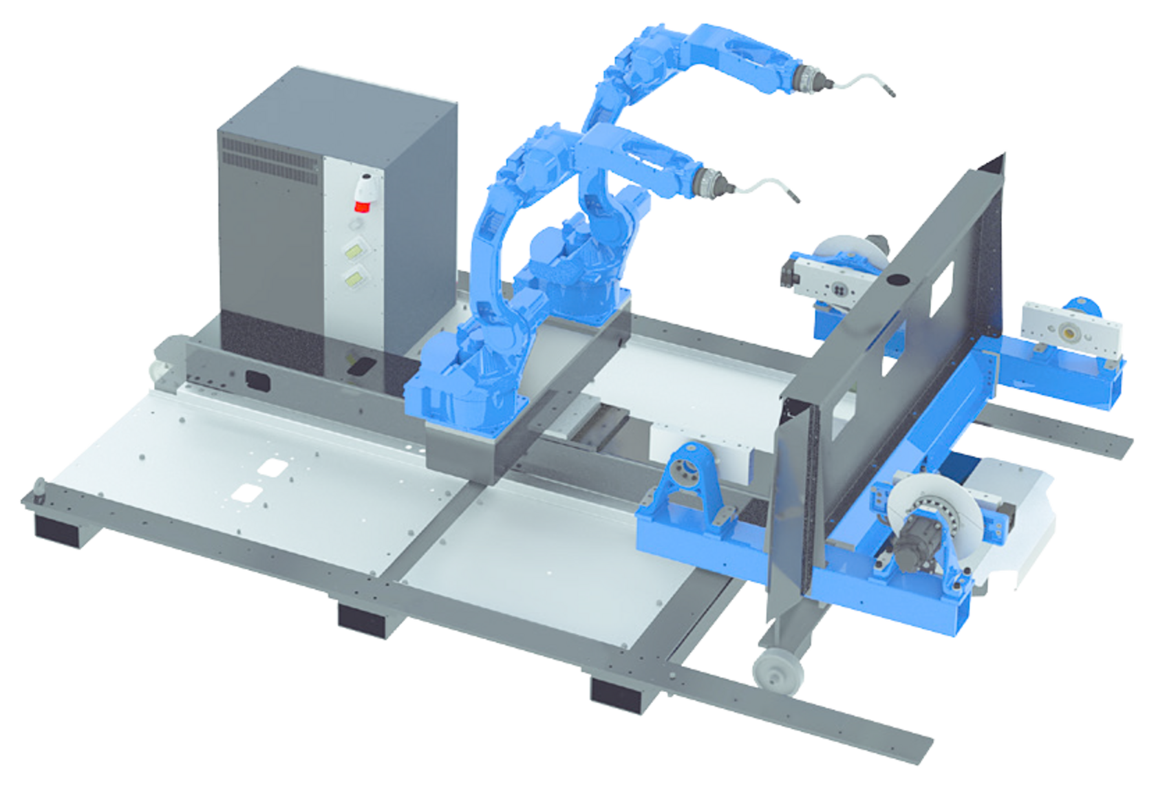 Diese Konfiguration eignet sich besonders für Betriebe, die geringe bis mittlere Produktionsvolumen haben oder wo die Teile komplexere Schweißnähte und eine höhere Präzision erfordern. In dieser Ausführung übernimmt ein Roboter das Schweißen an beiden Stationen, indem er zwischen den Stationen hin- und herwechselt. - Zwei-Roboter-Betrieb