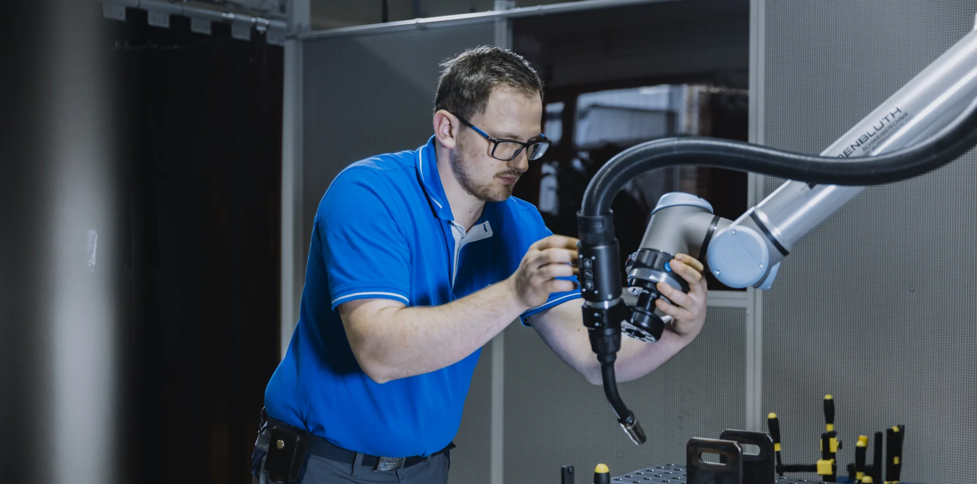 Die intuitive und besonders schnelle Bedienung des Cobots wird durch die benutzerfreundliche Steuerung am Brennerhalter ermöglicht. Die Freedrive-Funktion sowie das Einfügen von Wegpunkten und Schweißbefehlen erfolgen direkt an der Handhabungseinheit, wodurch die Programmierung erheblich vereinfacht wird. Farbige LEDs visualisieren und bestätigen eingefügte Wegpunkte und Funktionen, während eine zuschaltbare LED den Arbeitsbereich des Brenners beleuchtet und die präzise Positionierung des Cobots unterstützt.