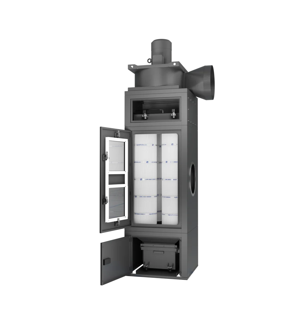 The welding fumes produced at the weld seam rise and are then captured via an extraction element (roof or rear wall) designed specifically for the system concept and directed to the filter system. There, the air is cleaned and returned to the room.